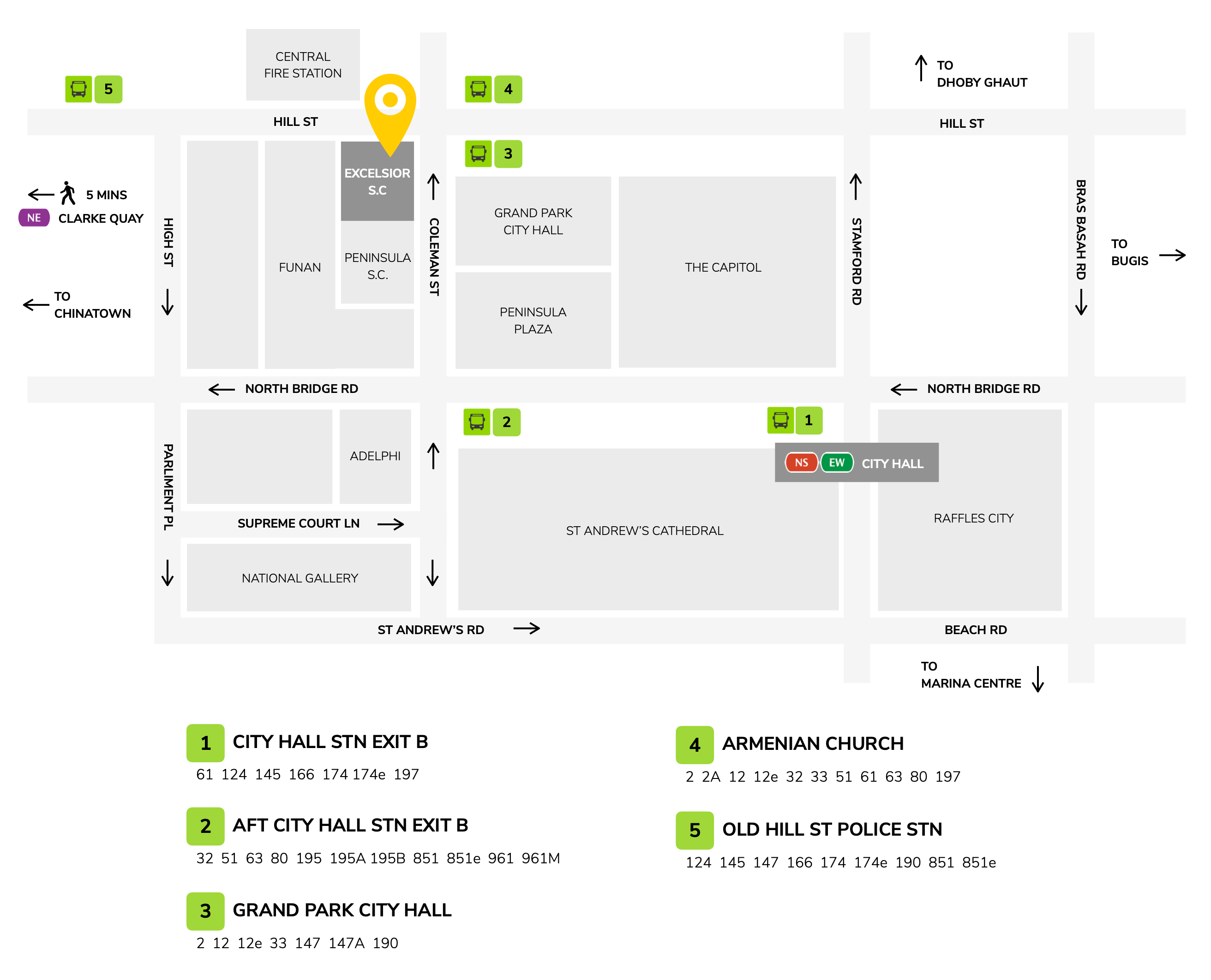 - City Hall (North-South/East-West Line): 5 min walk along North Bridge Road and Coleman Street