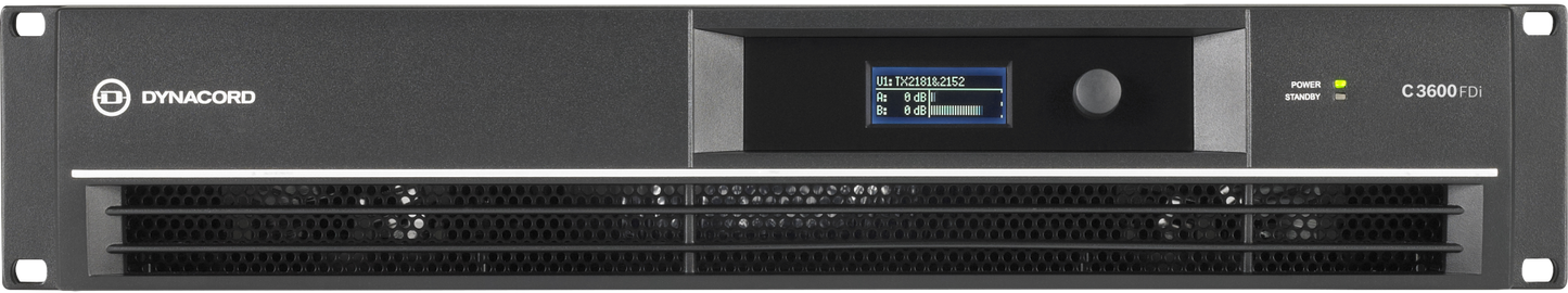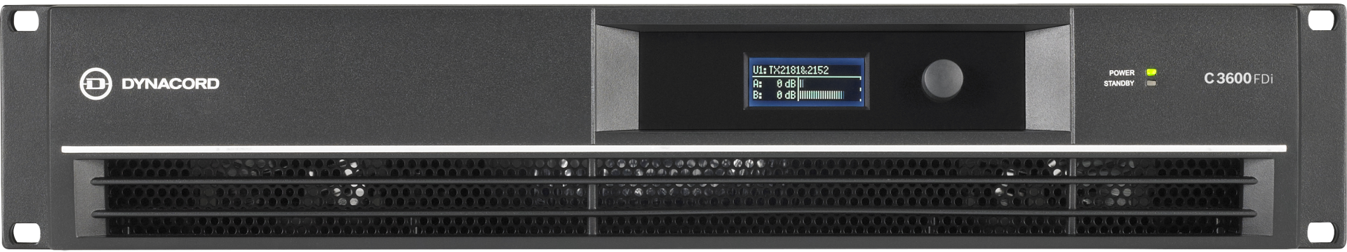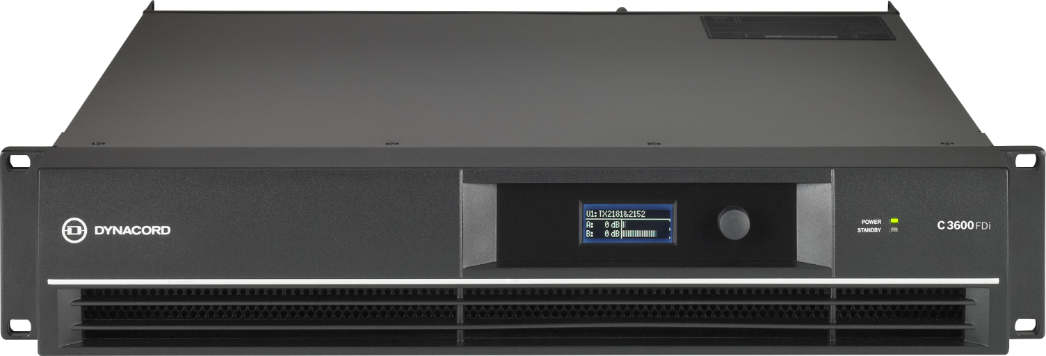 Dynacord C Series amplifiers are dedicated installation DSP amplifiers optimized for 24/7 operation. Besides low impedance operation (2 Ohms, 4 Ohms or 8 Ohms) C3600FDi can drive 100 V loudspeaker lines directly (‑1.5 dB) without output transformers. Integrated digital signal procesing provides access to professional speaker processing with FIR Drive technology. C Series amplifier utilize Class A/B resp. Class H topologies, which provide market leading acoustic performance and reliability. The connectivity is optimized for the needs of fixed install applications. For low cost of ownership a power saving standby mode is available. A front panel LC display allows local control and supervision of the amplifier. An intuitive system control software allows fast system setup, flexible system control and comprehensive supervision.