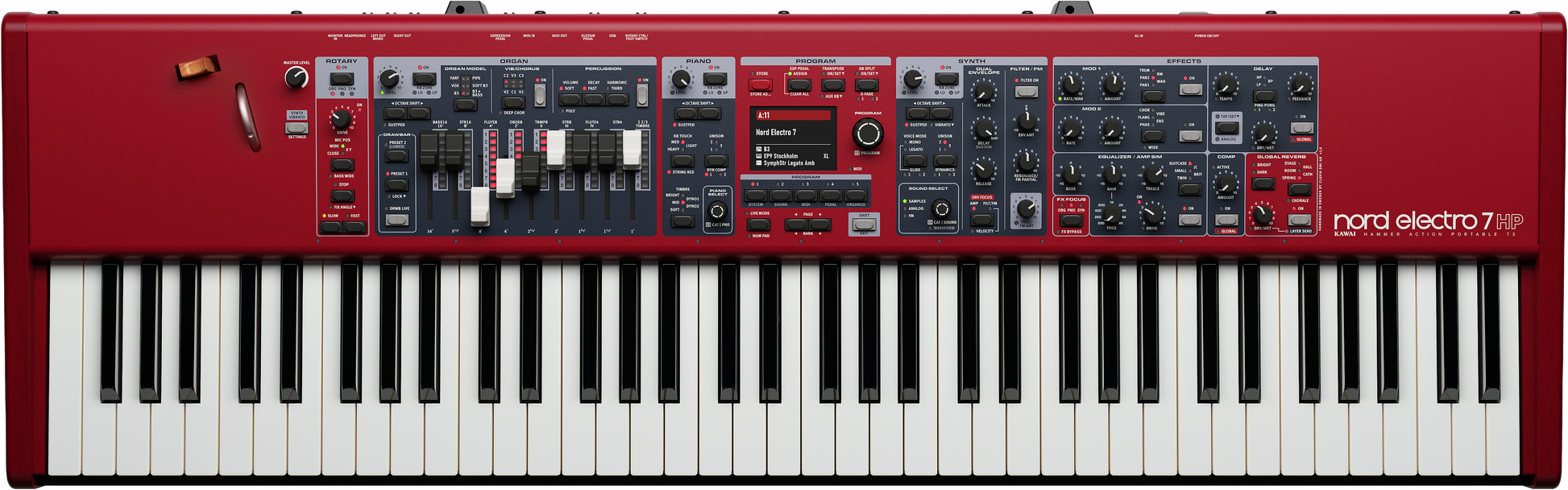 The Nord Electro 7 elevates the Electro series with a powerful new Synth Section, dedicated per-section effects and a refined panel design with a high-resolution color display. Combining Nord's latest piano features with the Organ and Rotary Speaker from the acclaimed Nord Organ 3, the Nord Electro 7 offers exceptional versatility in a lightweight, stage-ready instrument.